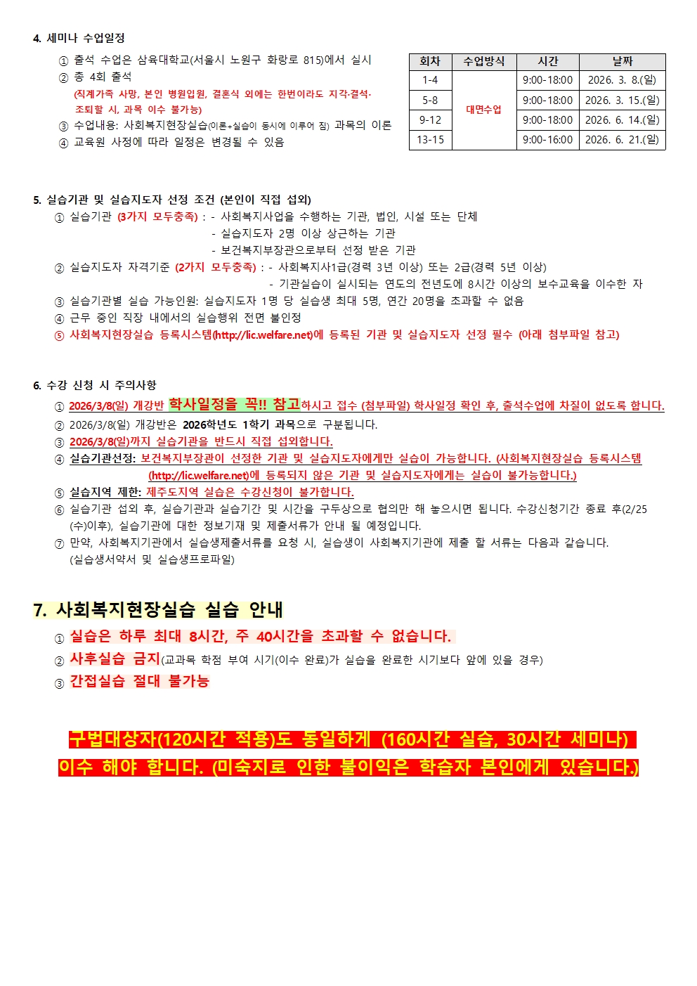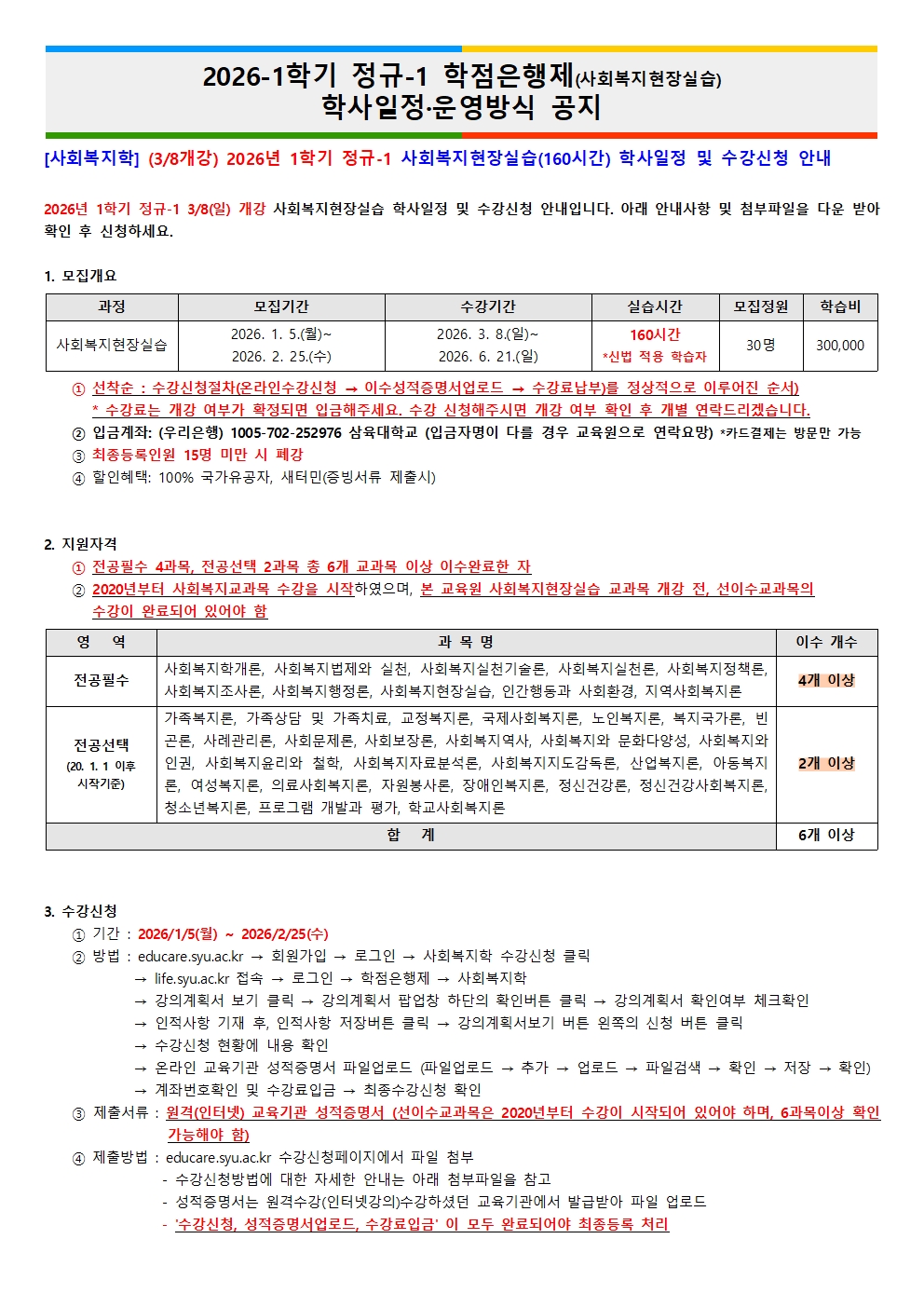 제목 [사회복지학] (3/8개강) 2026년-1학기 정규 사회복지현장실습(160시간) 학사일정 및 수강신청 안내