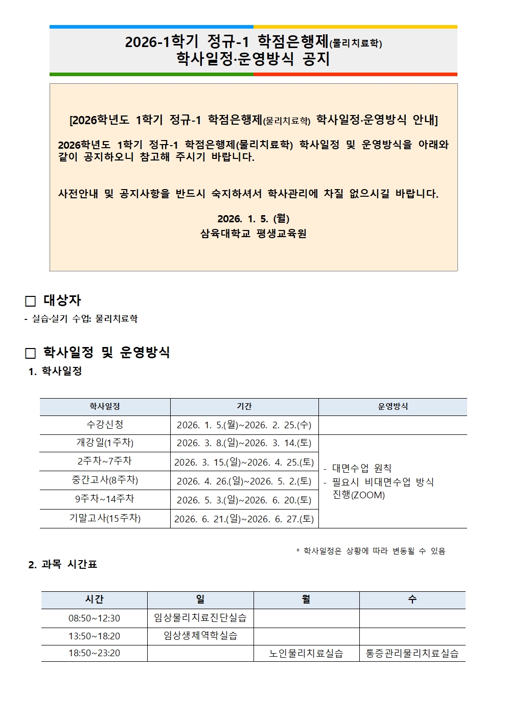 제목 [물리치료학] (3/8개강) 2026-1학기 정규 학점은행제(물리치료학) 수강생 모집 및 학사일정·운영방식 공지
