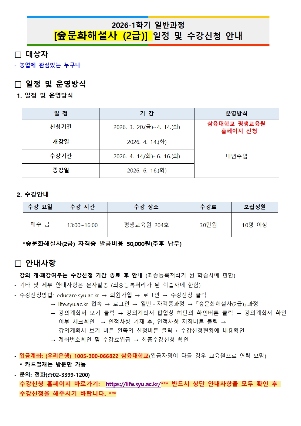 제목 ★★[일반과정_숲문화해설사 2급] 4/14(화) 개강 _ 2026년 1학기 일정 및 수강신청 안내★★